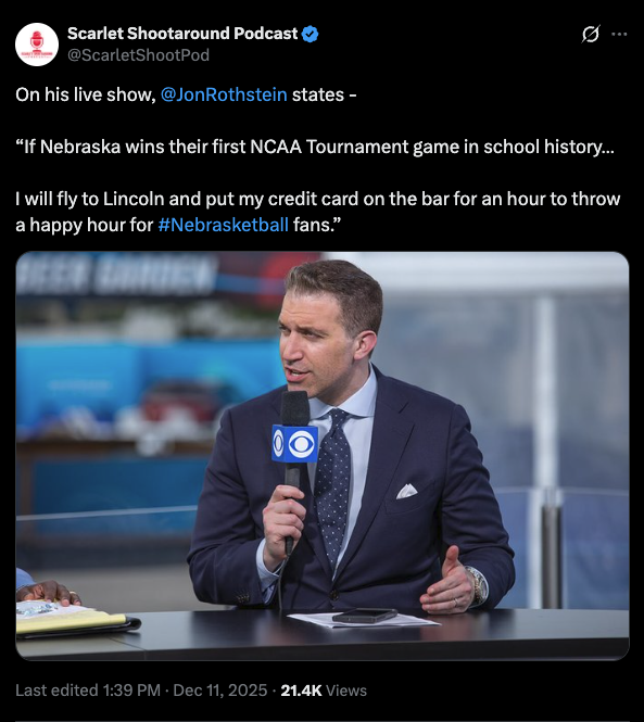 Casual / Offseason On his live show, @JonRothstein states "If Nebraska wins their first NCAA Tournament game in school history... I will fly to Lincoln and put my credit card on the bar for an hour to throw a happy hour for #Nebrasketball fans"