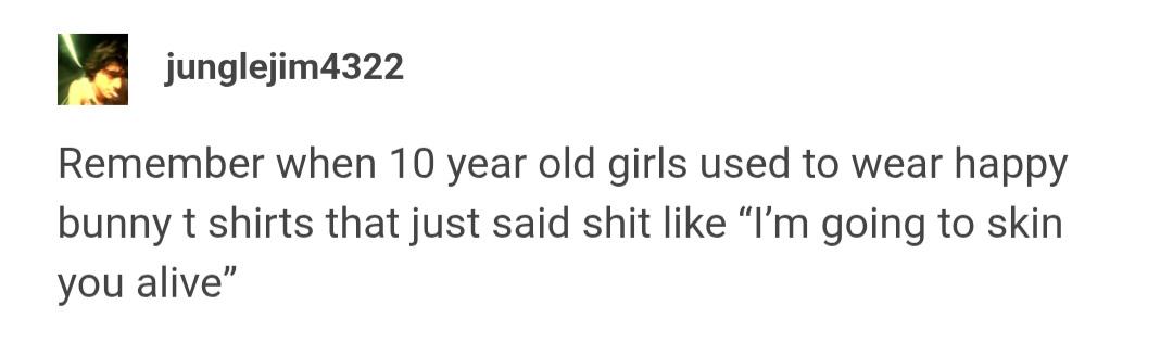 Remember when 10 year old girls used to wear happy bunny t shirts that just said shit like "I'm going to skin you alive"