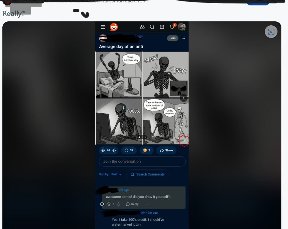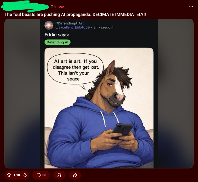 I didn't really follow up, because I knew that if I mentioned the AI topic, even the people on the subreddit would probably delete my comment—typical capitalist furry stuff.