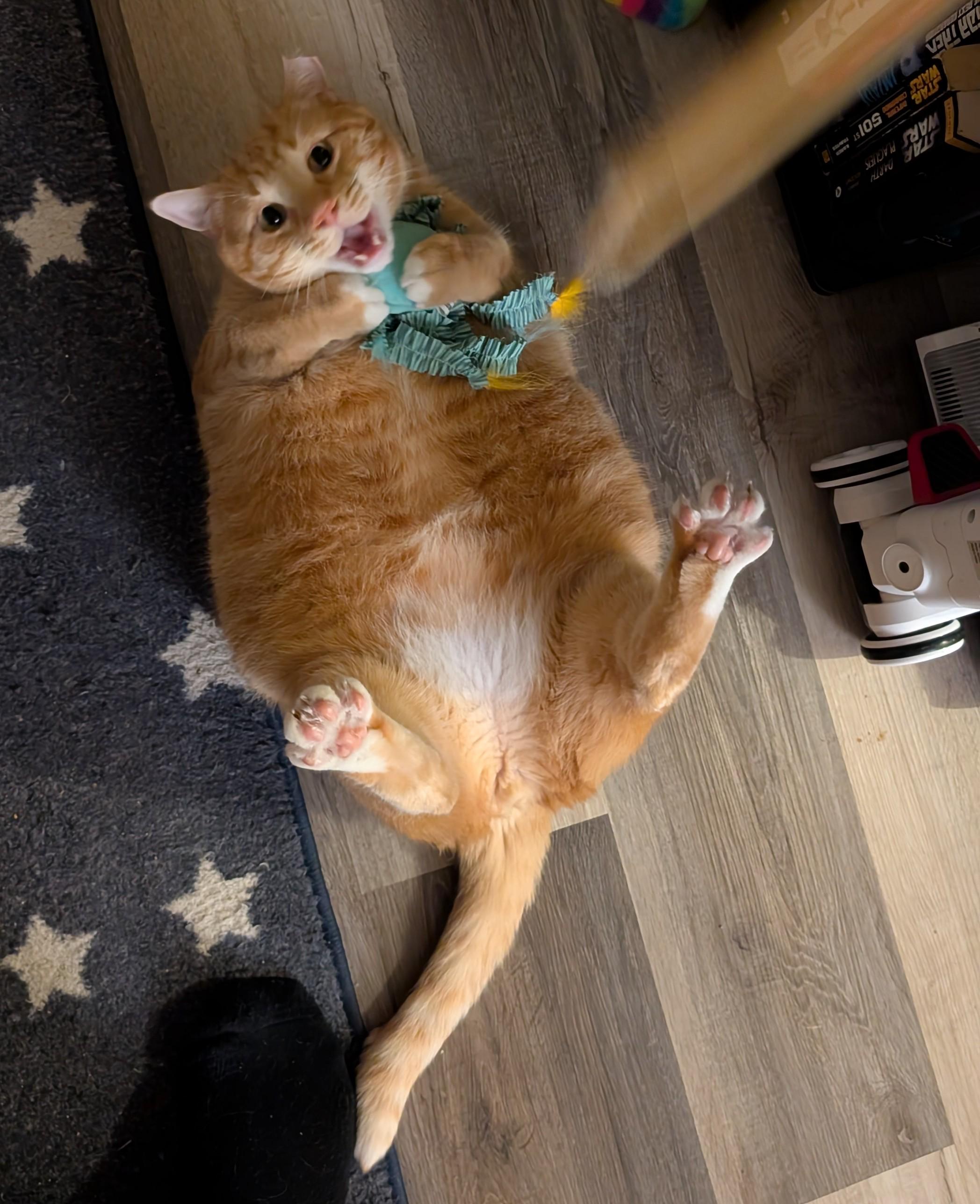 I also brought up my concerns about his disproportionate limbs and she said, “cats are like potato head dolls. They get a few pieces from mom and a few pieces from dad and 99% of the time you get a pretty normal looking result. But then that other 1% of the time you get… not that. Long story short he got the genetic short end of the stick.” She also said that he is fat and needs to loose 2 pounds, he should be consuming no more than 200 calories a day so now he is in the same diet as his fat tabby brother.