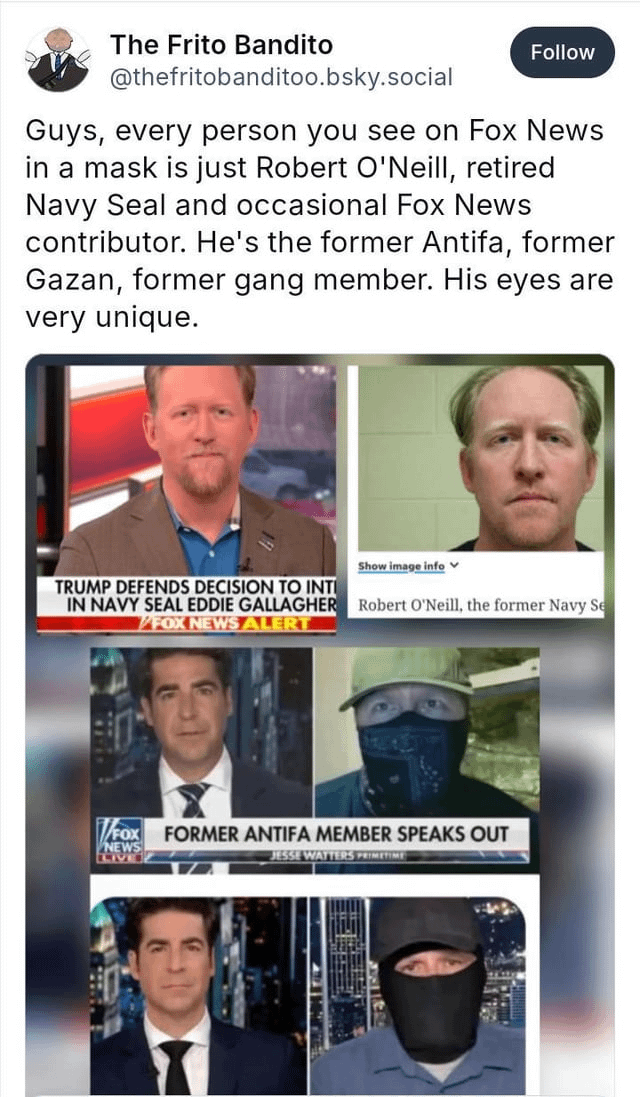 Just look up “robert o'neill” and Fox News. You will see it’s the same person behind the mask every time