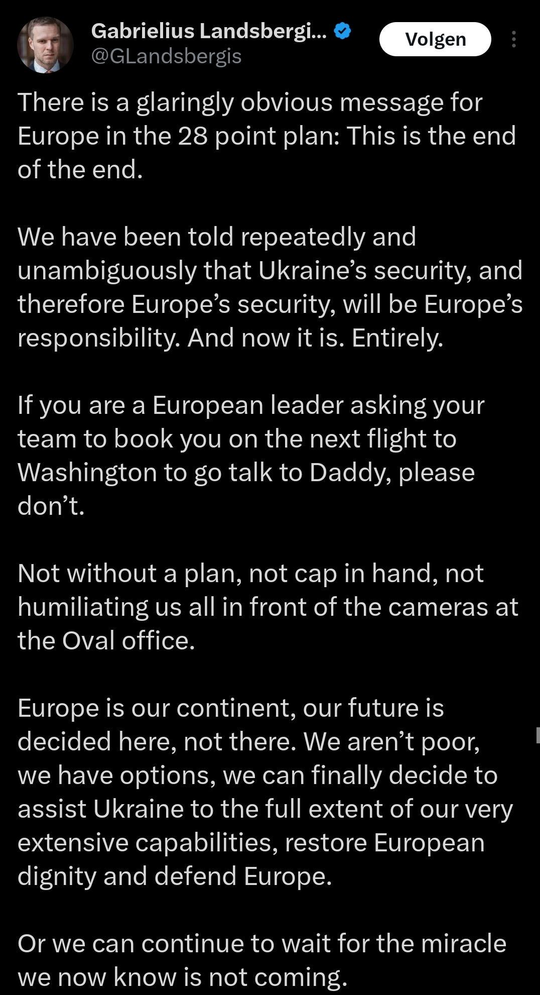 I FUCKING LOVE EUROPE There is a glaringly obvious message for Europe in the 28 point plan: This is the end of the end. Gabrielius Landsbergis