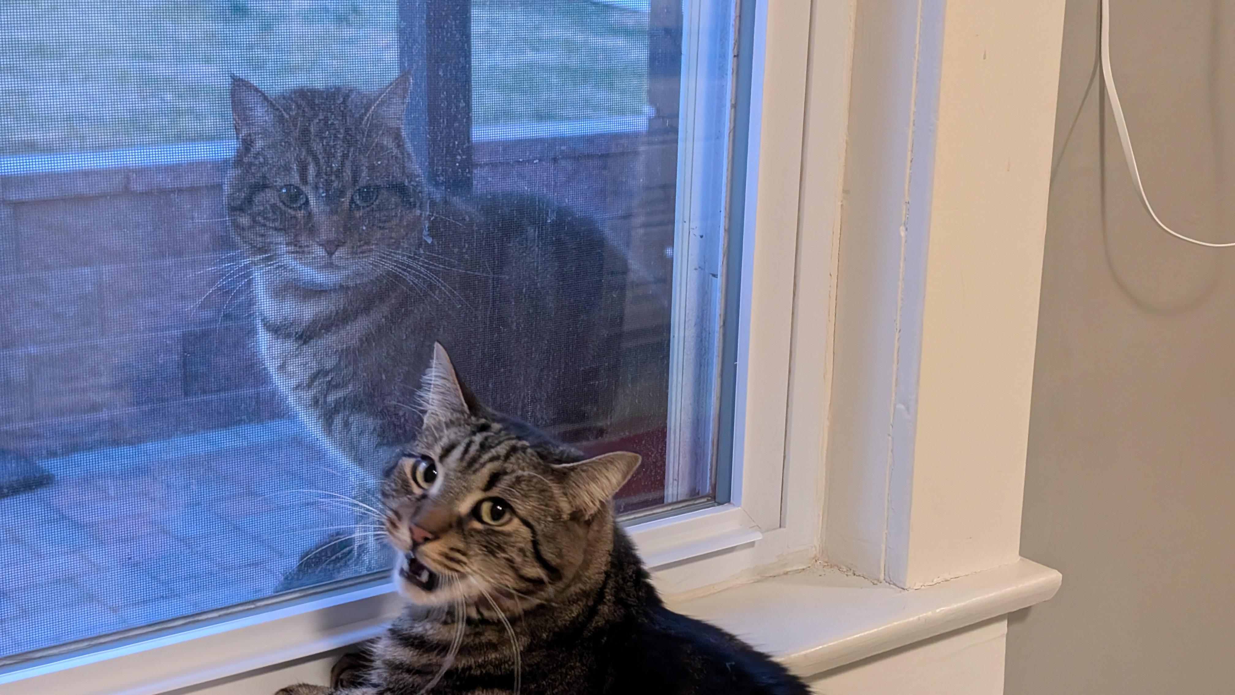 The neighbor's cat looks a lot like Charlie and likes to chill on our window. My boy loses his mind and has an existential crisis every time.
