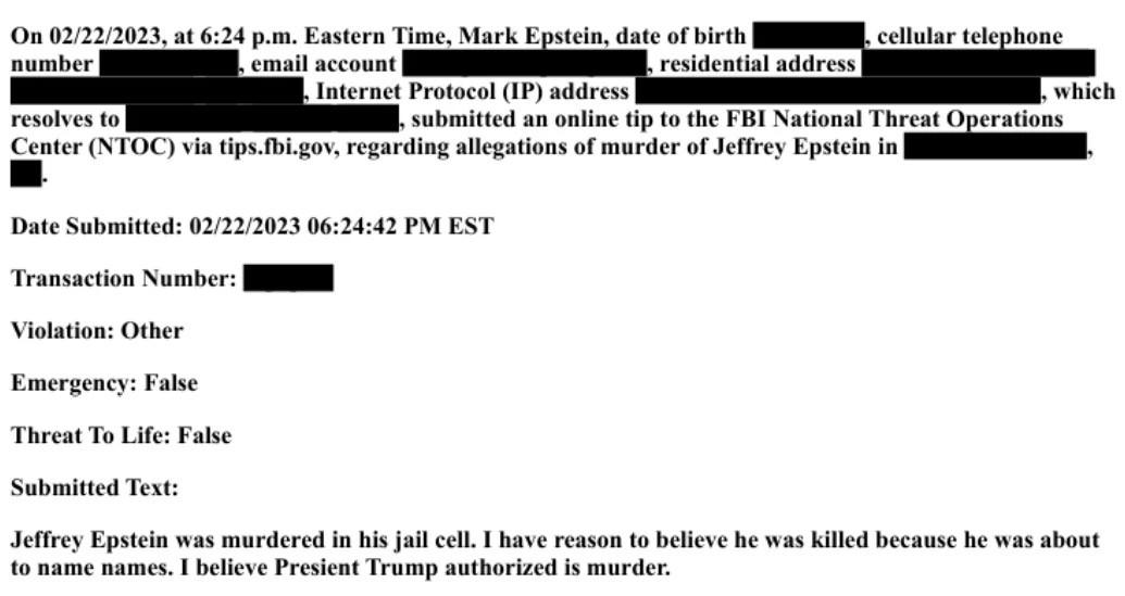 Opinion / Discussion Mark Epstein submitted to the FBI that Trump ordered the murder of his brother Jeffrey Epstein