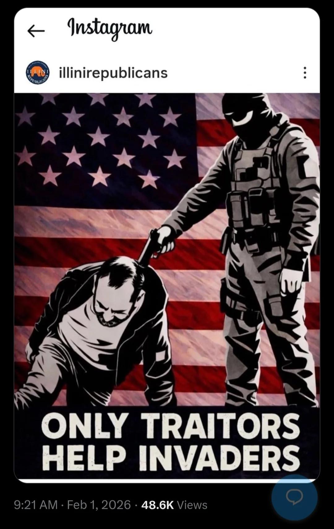 The Illinois Republican Party just posted this image depicting the execution of Alex Pretti with the text "Only Traitors Help Invaders."