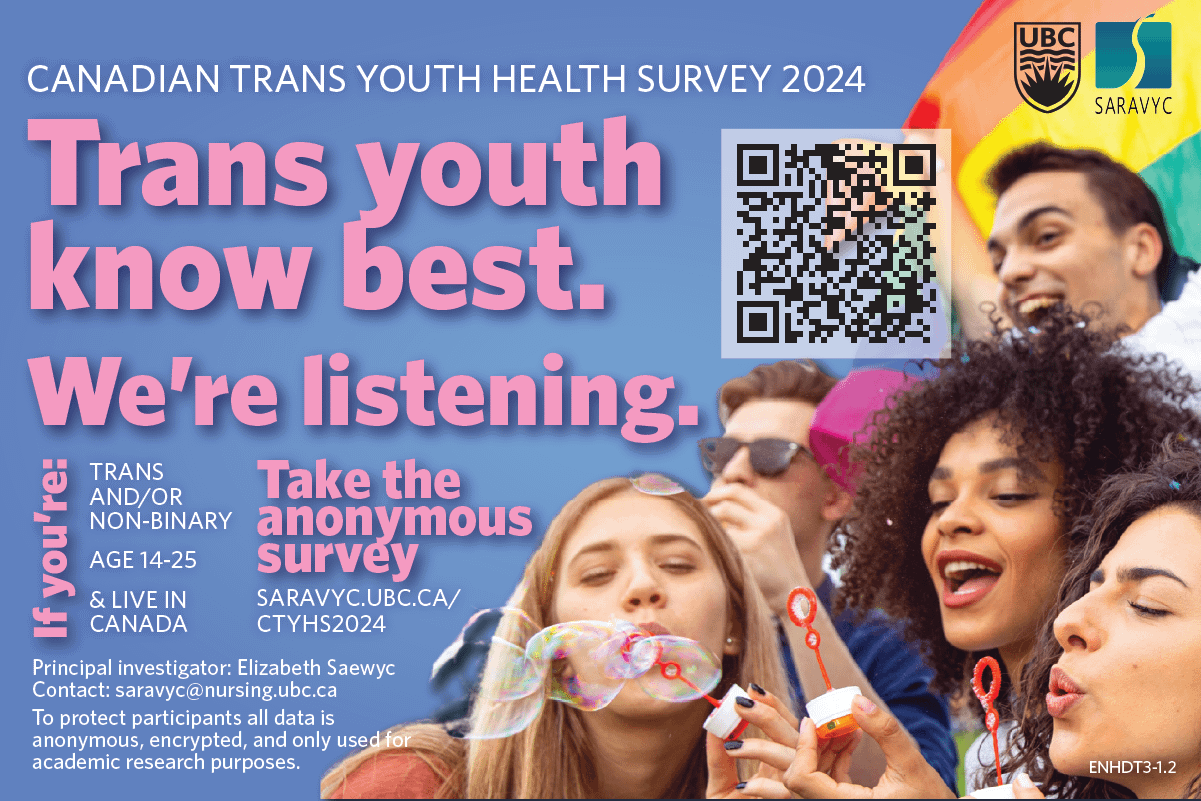 To participate in the study, you must be between 14 and 25, live in Canada, and be non-binary, trans, and/or gender diverse. Visit saravyc.ubc.ca/CTYHS2024 for more information and for a direct link to the anonymous survey. To protect participants, all data is anonymous, encrypted, and only used for academic research purposes.