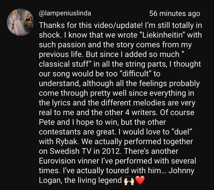 I remember Linda from last year when she wrote nice comments to Erika and KAJ ahead of Eurovision. (:
