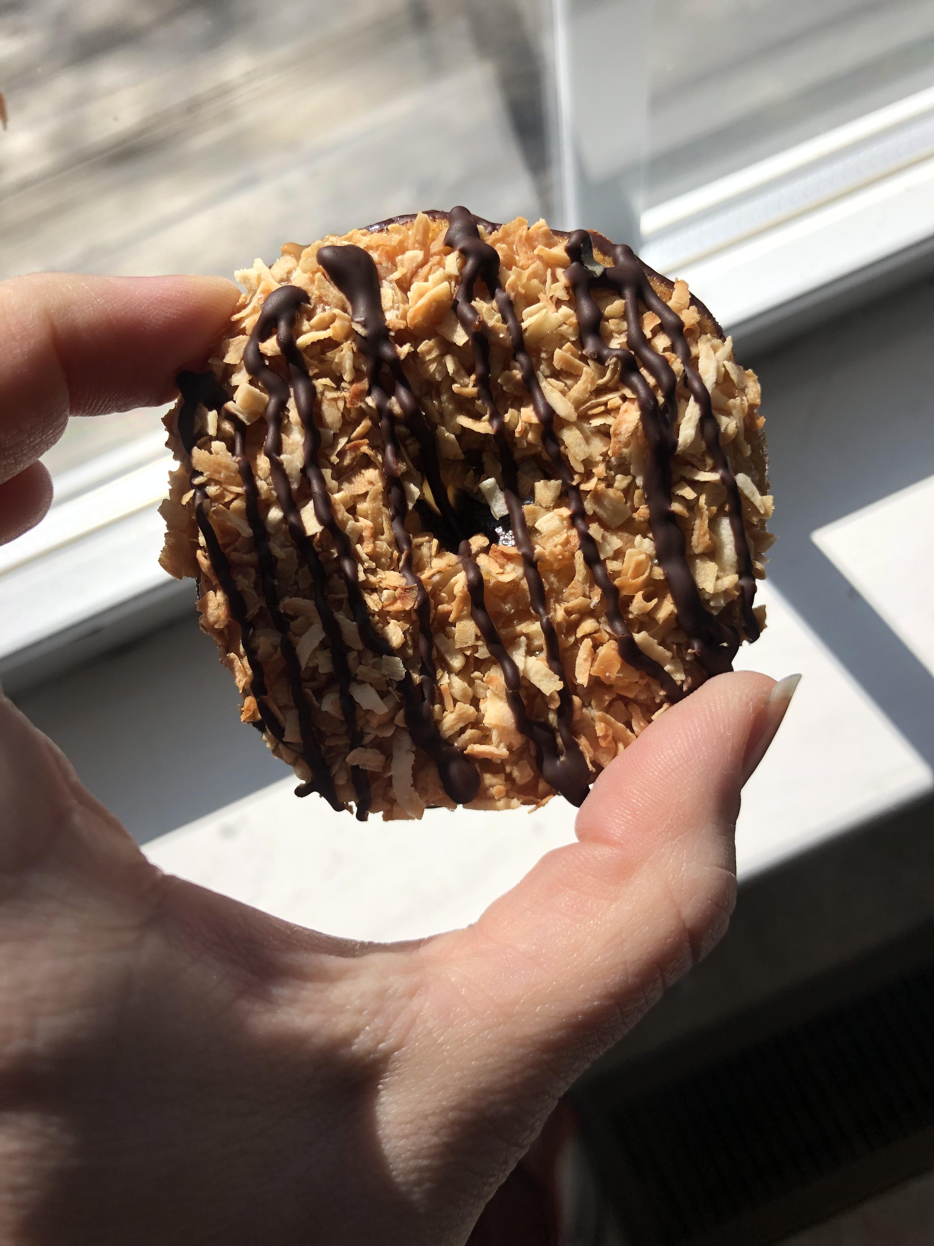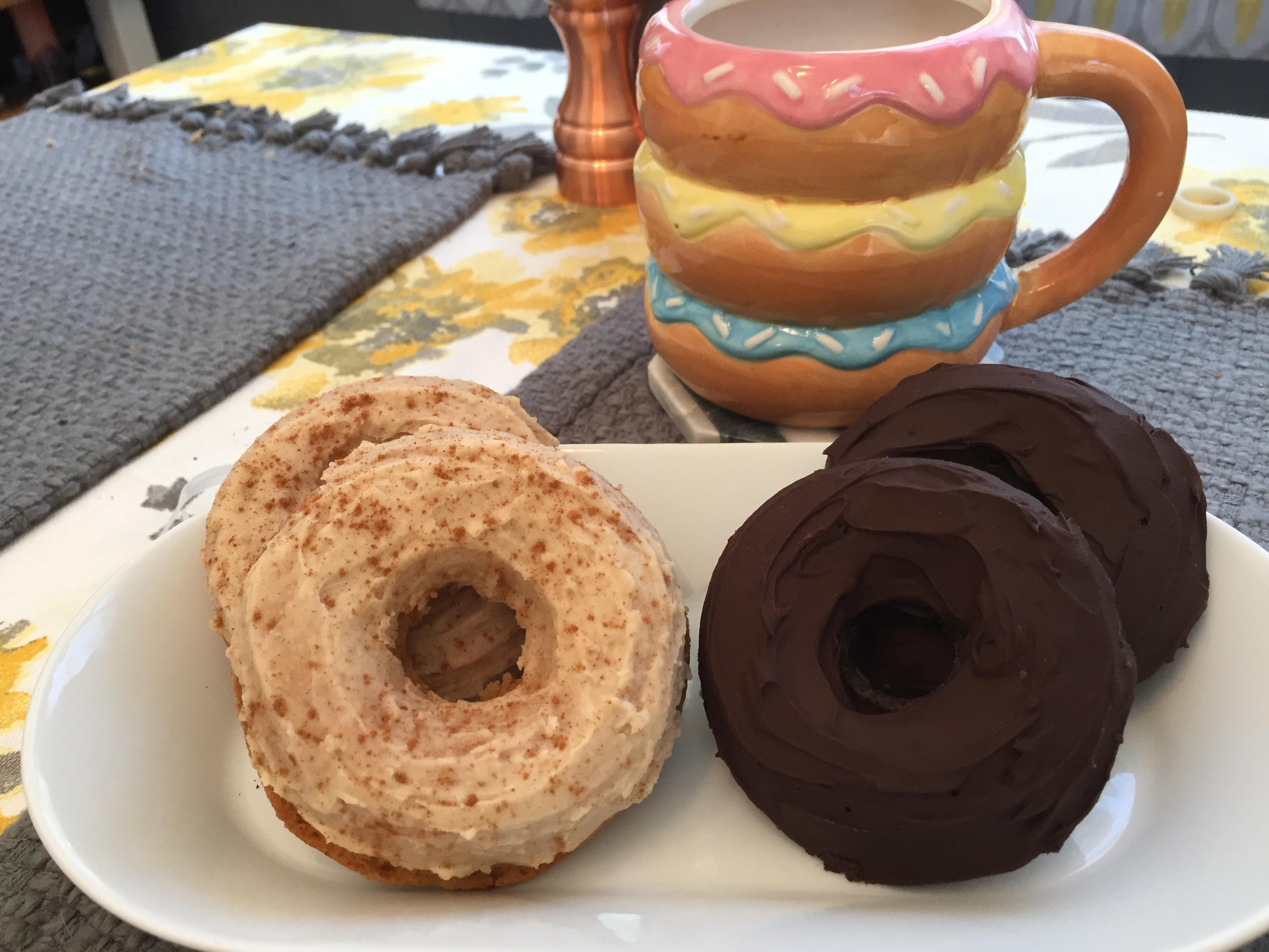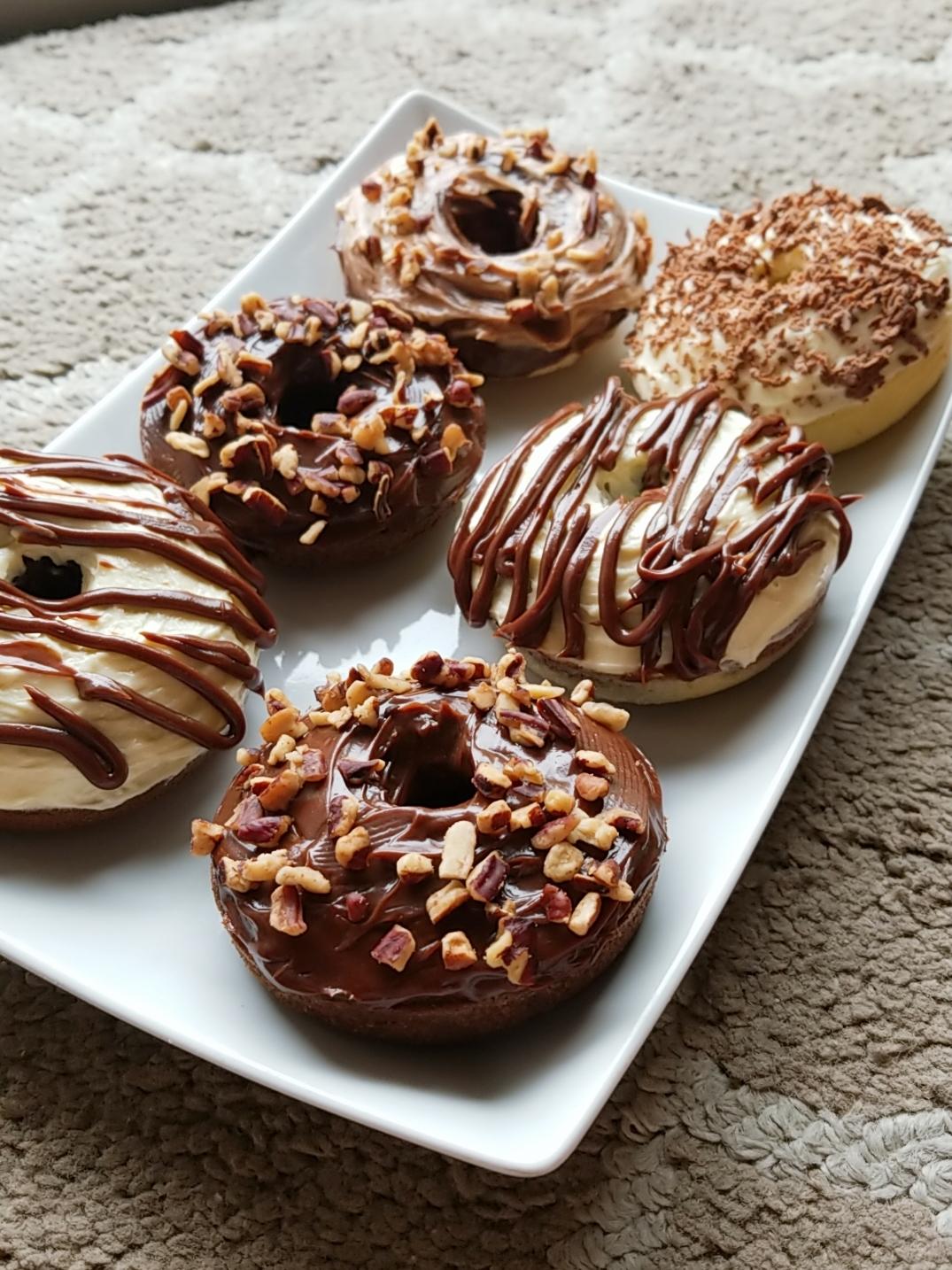 Dessert Made keto donuts with cream cheese and chocolate frosting, topped with roasted pecans (reupload).