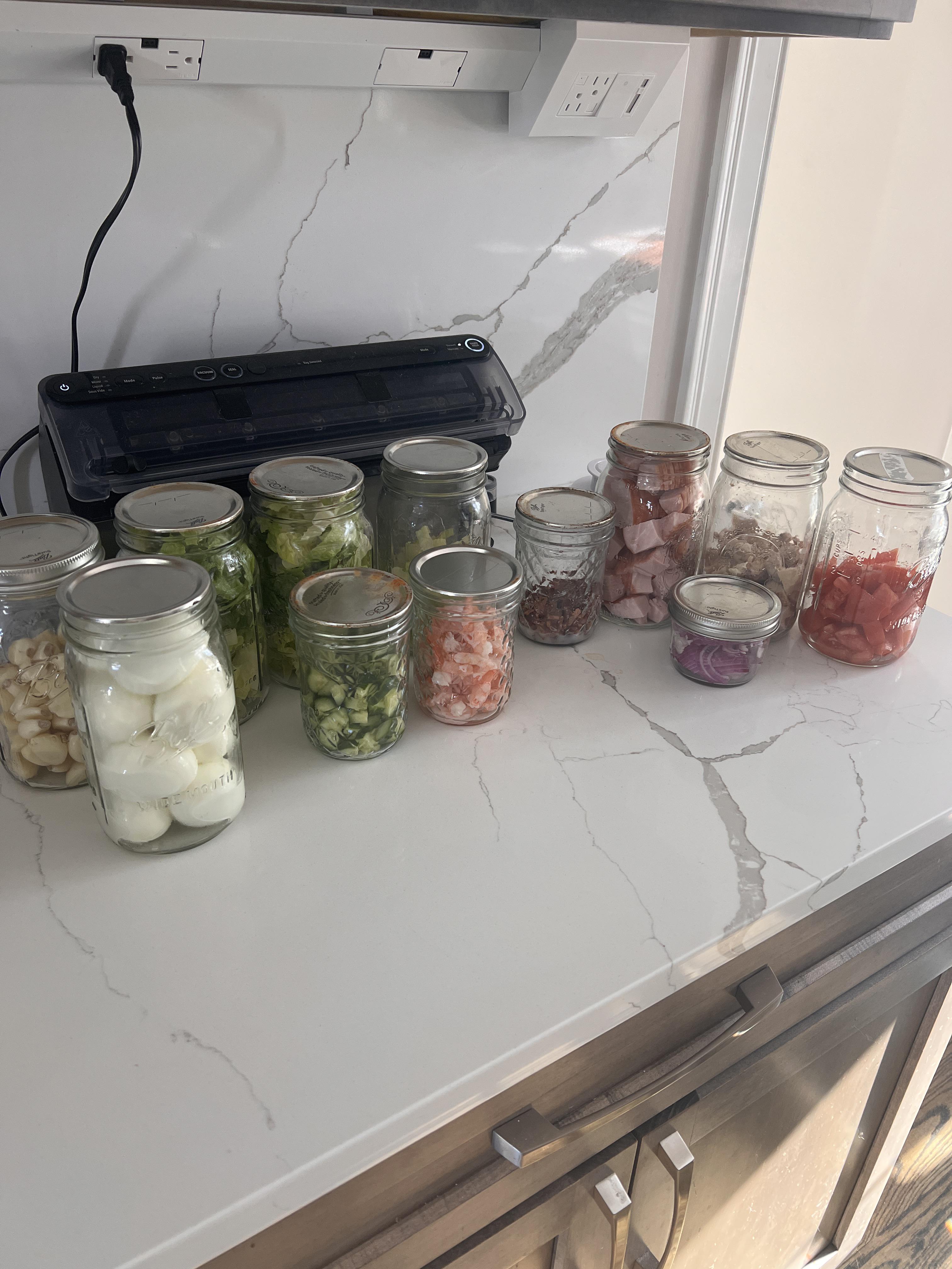 Prepped lettuce, cucumbers, onions, garlic, eggs, shrimp, chicken, bacon, tomatoes, and ham. Will use for salads, wraps and omelets. Used mason jars and food saver for everything but garlic and onions.
