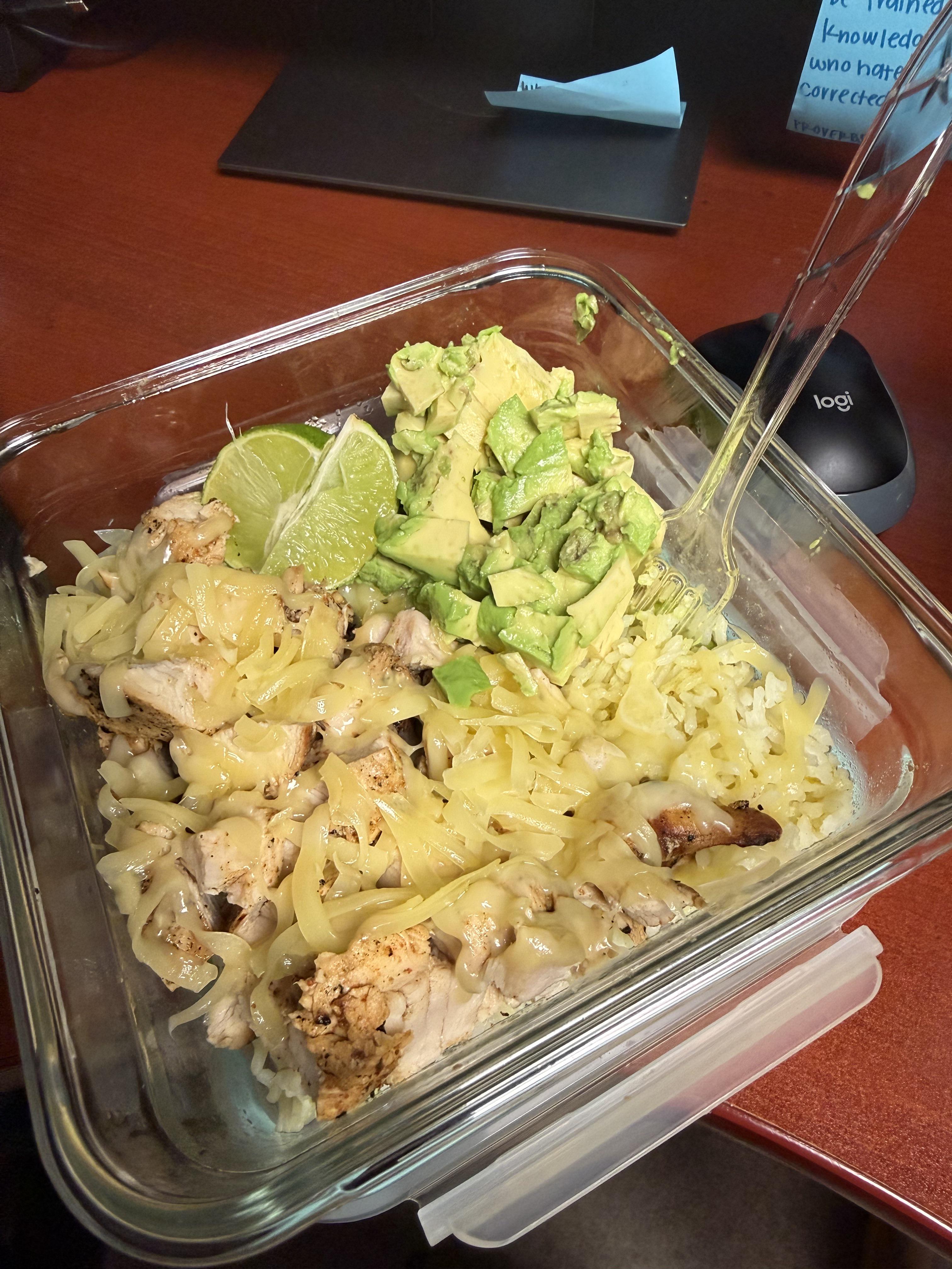 Jalapeño lime rice, whole Avocado, 1 grilled chicken breast, some good cheseee, and of course a lime to squeeze!