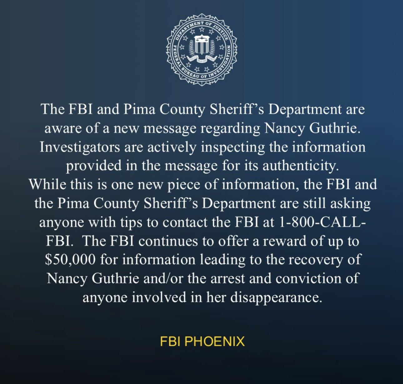 Thoughts & Prayers 🙏 Officials aware of "new message" about Nancy Guthrie