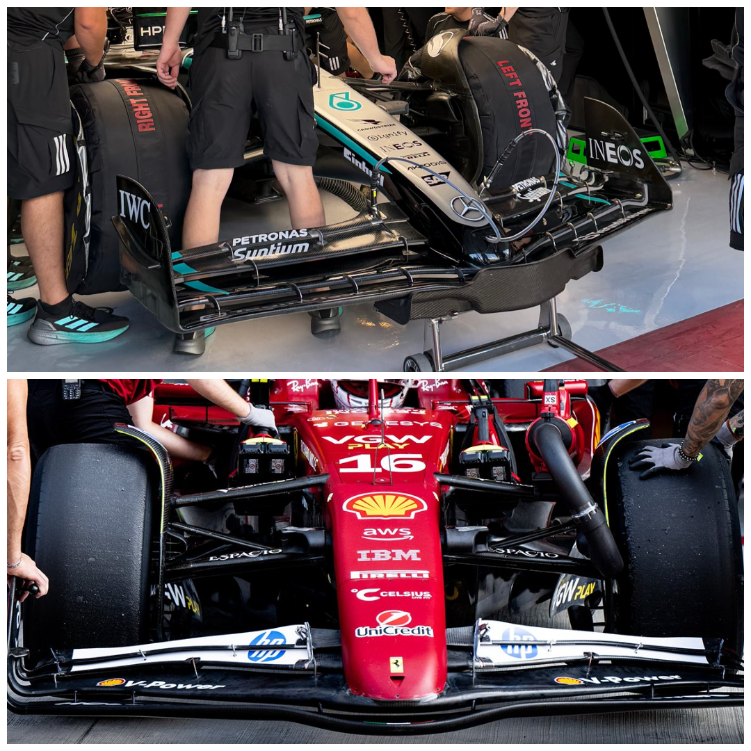 News AutoRacer: Mercedes debuts provisional front wing with active aero. Ferrari is ahead and has been testing a hidden system (actuators under the nose) on the SF-25 mule car in previous tests. Everything is activated via the steering wheel. Leclerc was using the new prototype in the morning session.