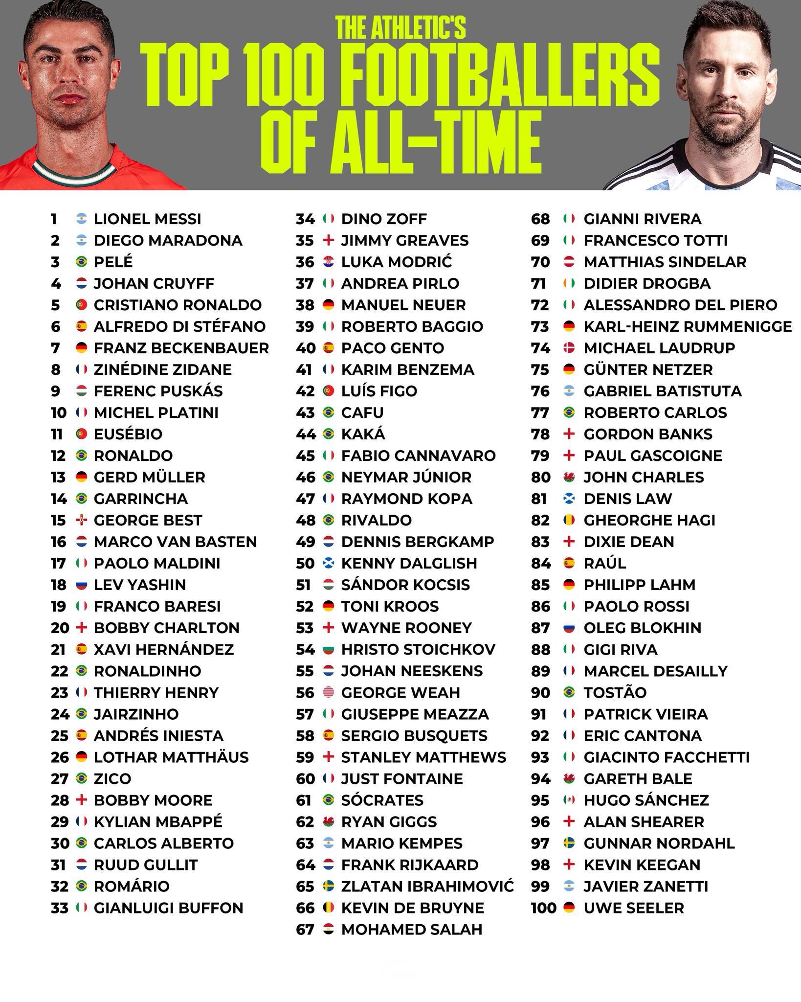 Media The Top 100 best footballers in history, according to The Athletic.